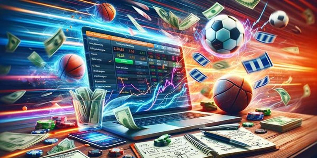 A vibrant illustration of a laptop displaying betting odds and financial graphs, surrounded by basketballs, footballs, money, chips, and betting slips. The image represents market coverage and volume scalability in betting, showing how data-driven systems handle large volumes of bets across different sports while maintaining efficiency and profitability.