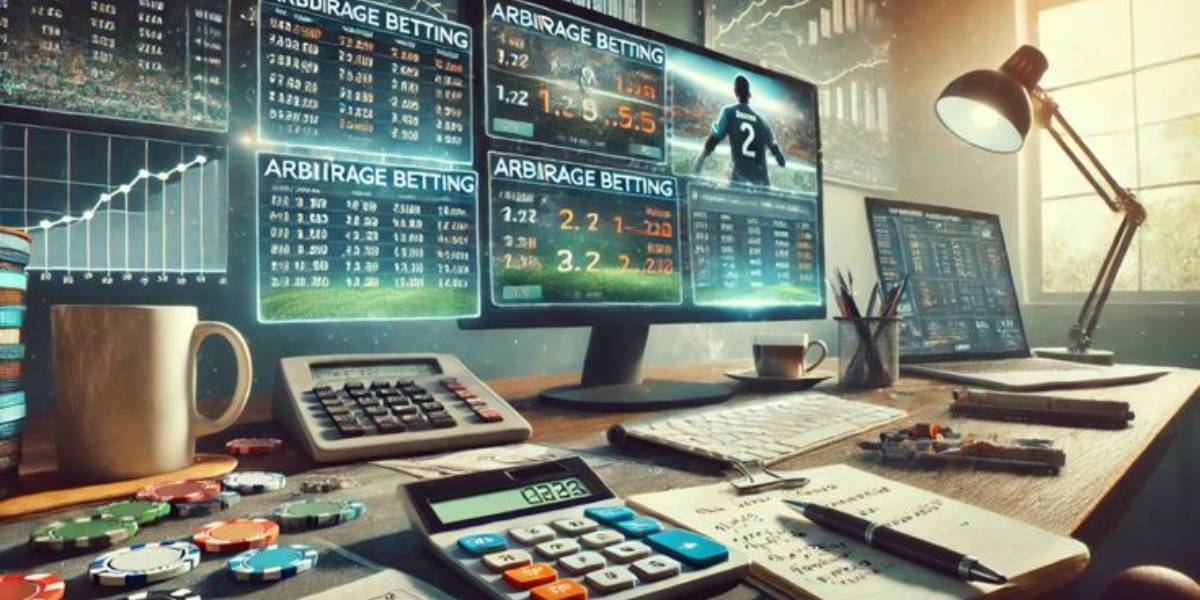 A detailed desk setup featuring multiple monitors showing arbitrage betting data, calculators, notes, and betting chips. The image illustrates bonus exploitation and matched betting, highlighting the contrast between manual betting strategies that rely on calculations and records versus automated tools that streamline processes for efficiency and accuracy.
