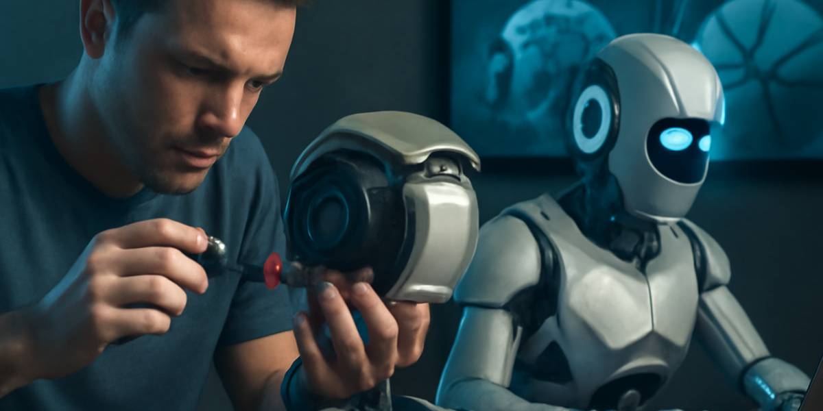 A man focuses on repairing a robotic component while a humanoid robot sits beside him, symbolising the maintenance and technical requirements of betting bots. The image highlights how both hardware upkeep and software optimisation are essential to ensure smooth operation, reliability, and performance in automated betting systems.