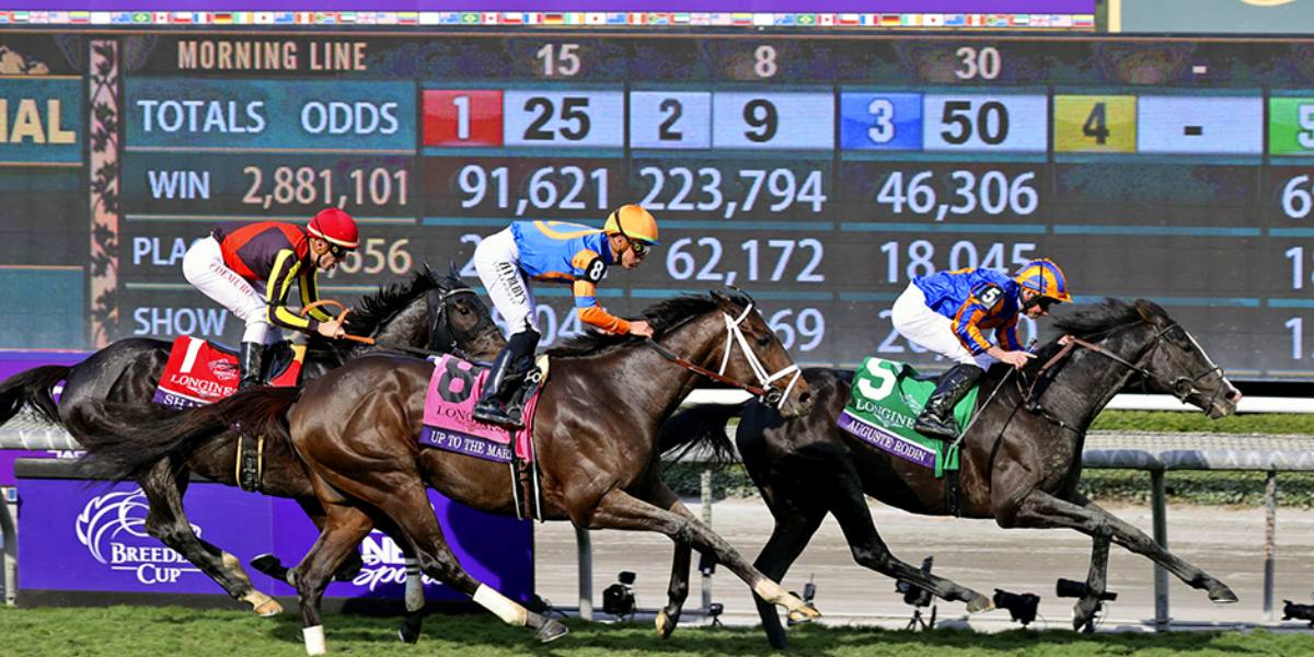 A thrilling photo of horses competing at the Breeders Cup, showcasing the dynamic world of horse racing and wagering. The odds board in the background reflects the popularity of exotic bets such as exactas, trifectas, and superfectas that give bettors a chance at higher returns compared to standard win, place, or show wagers.