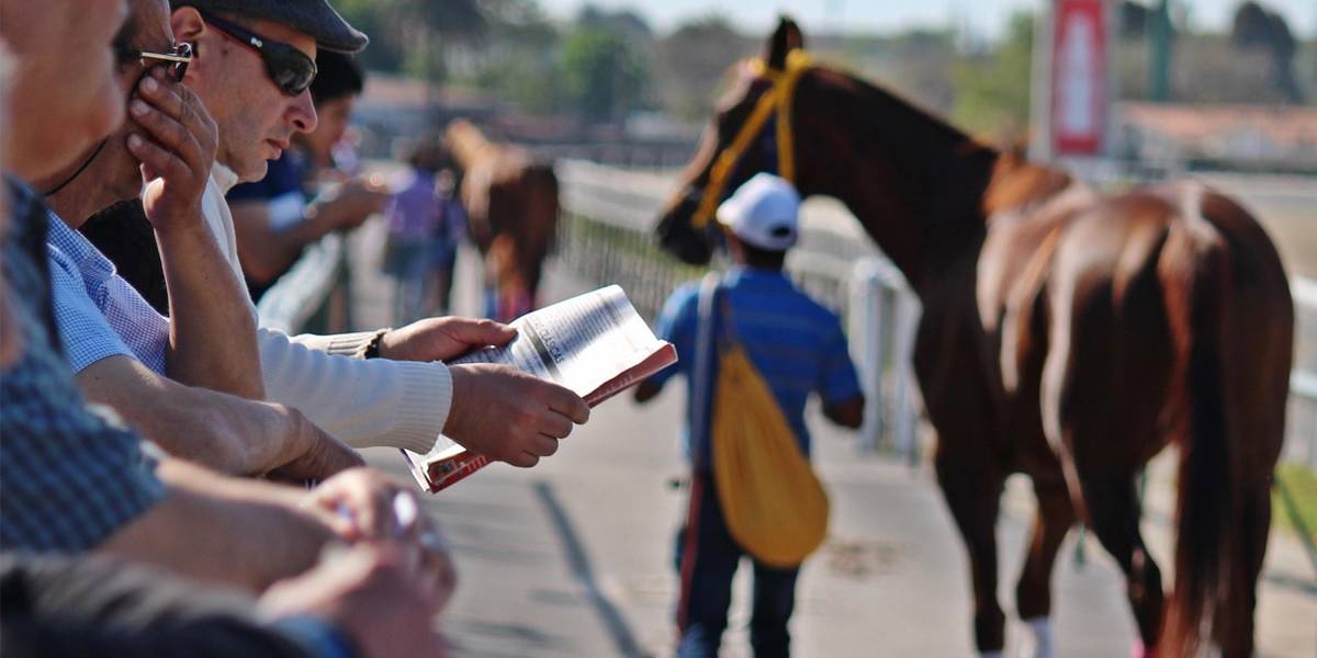 Racegoers studying a form guide at the track, analysing betting mechanics before placing exotic bets.