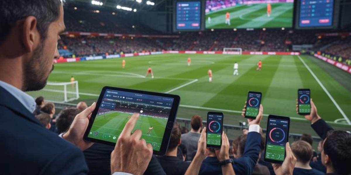 A group of football fans inside a stadium watch the match while checking live statistics and betting data on smartphones and a tablet. The screens display match analytics and real time performance metrics, showing how spectators follow game insights and betting information during live sporting events.
