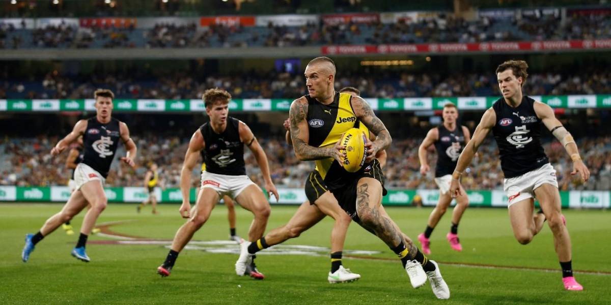 A Richmond Tigers player runs with the ball during an AFL match against the Carlton Blues, surrounded by opponents on the field.