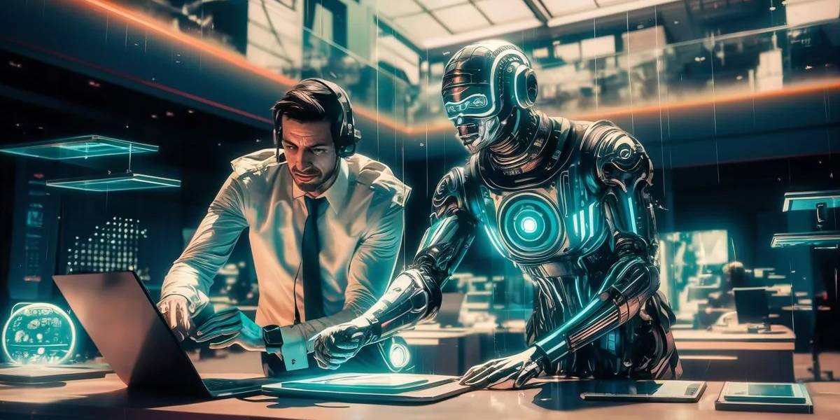 The image illustrates a professional collaborating with a robot, symbolising the advanced technology behind different types of betting bots. These automated systems are used to analyse data, place wagers faster, and adapt to changing odds, offering punters a range of strategies for sports betting and online gambling.