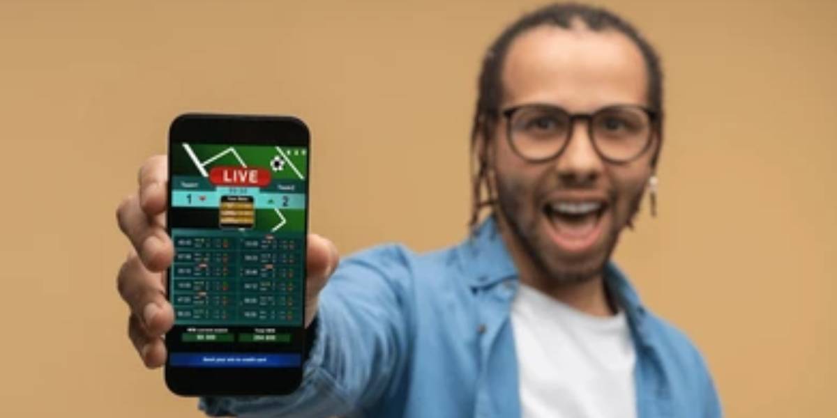 The image shows a person excitedly holding up a smartphone with a live betting screen visible. It represents the process of checking odds and comparing offers when looking for suitable matched betting opportunities, emphasising quick access through mobile apps.